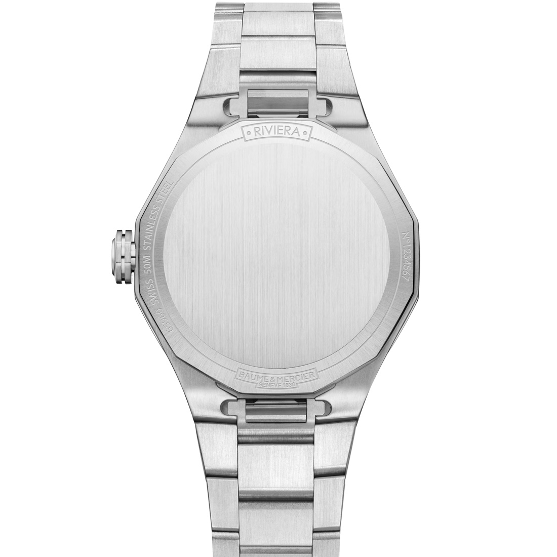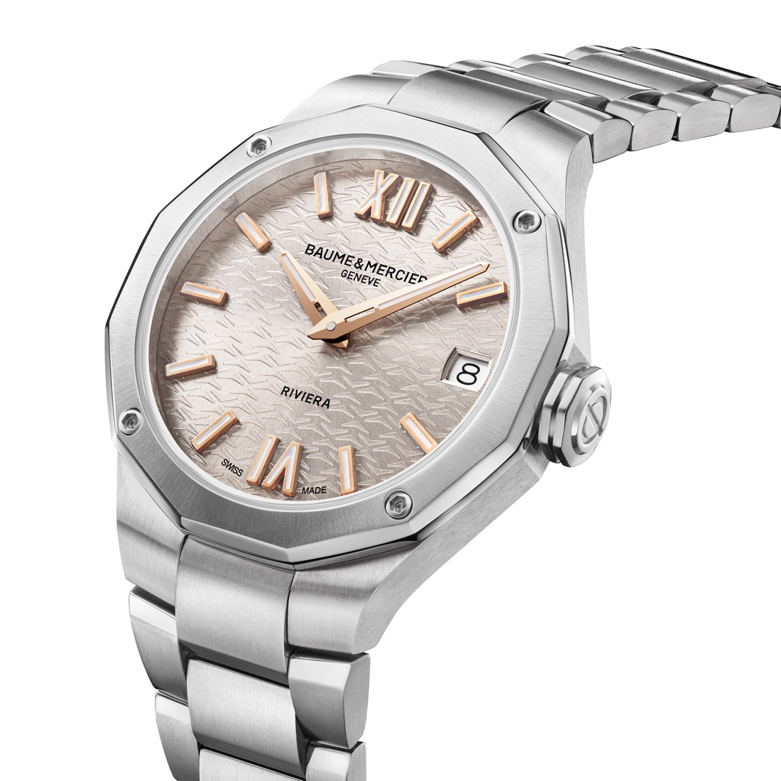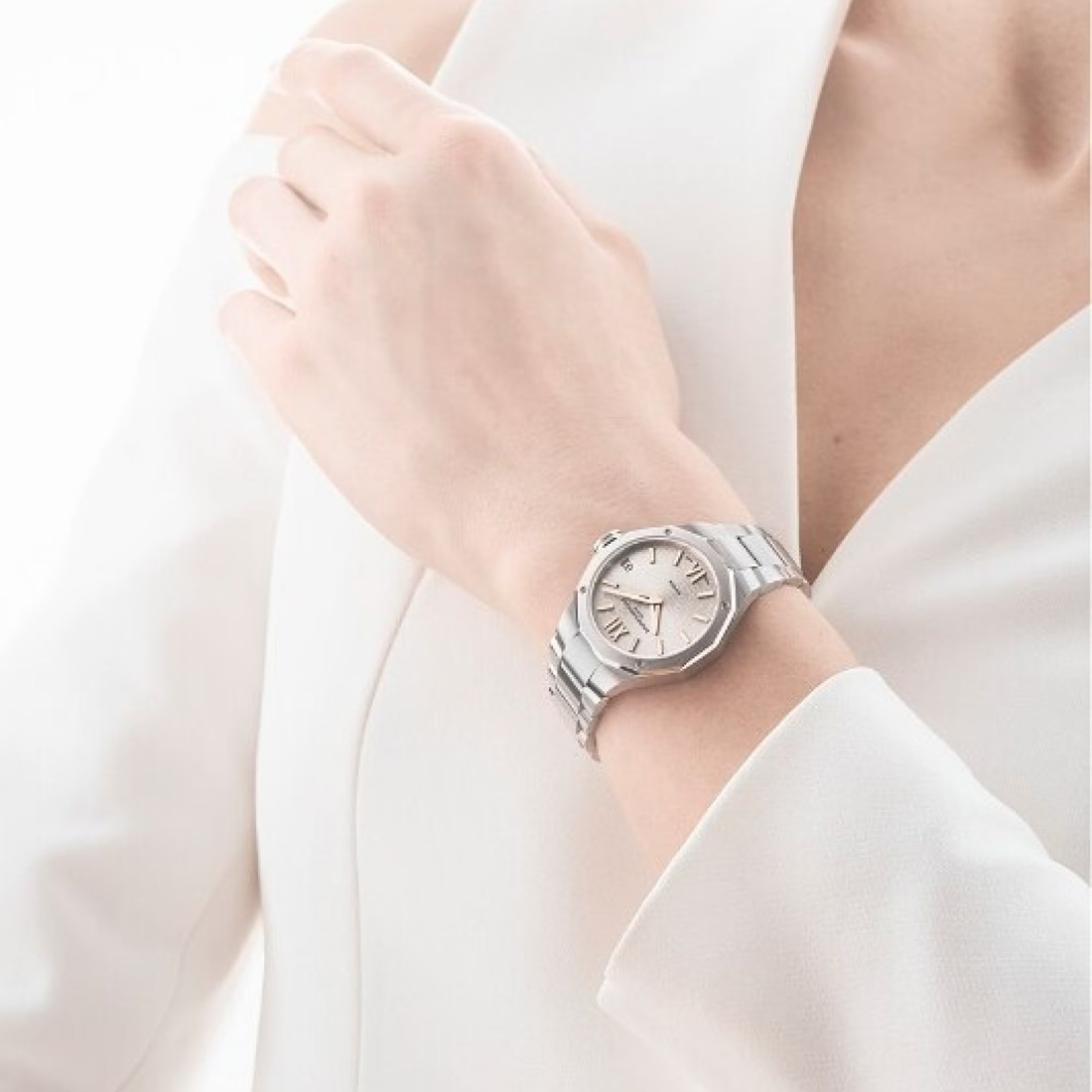 Il Riviera 10810 è impreziosito da un quadrante argento caldo satinato soleil e da una decorazione a onde trasparenti con numeri romani e indici rivettati dorati 5N rivestiti di Superluminova bianco. La cassa dodecagonale in acciaio inossidabile lucidato e satinato è dotata di una corona libera ottagonale con logo Phi in rilievo. Il bracciale intercambiabile in acciaio inossidabile è dotato di un affidabile sistema di sostituzione senza attrezzi.