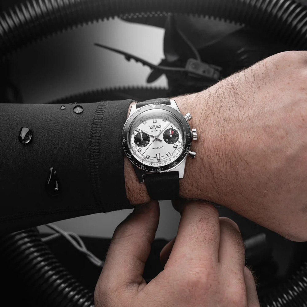 Nel 2023, Vulcain ha riproposto uno dei suoi orologi subacquei più iconici, lo Skindiver Nautique, un modello che ha lasciato il segno nel panorama orologiero degli anni '60. Ma la storia non finisce qui. Pochi sapevano che, contemporaneamente, la manifattura di Locle aveva sviluppato anche una versione cronografica di questo orologio-strumento. Rimasto nascosto agli occhi del pubblico per decenni, ora sta tornando alla ribalta grazie agli sforzi di ricerca e riscoperta guidati da Guillaume Laidet, che supervisiona lo sviluppo delle collezioni Vulcain dal 2022. Riportando in vita questo segnatempo dagli archivi, Vulcain offre ai collezionisti un orologio autentico e tecnico al tempo stesso, un vero omaggio alla tradizione del marchio di orologi subacquei d'eccezione.