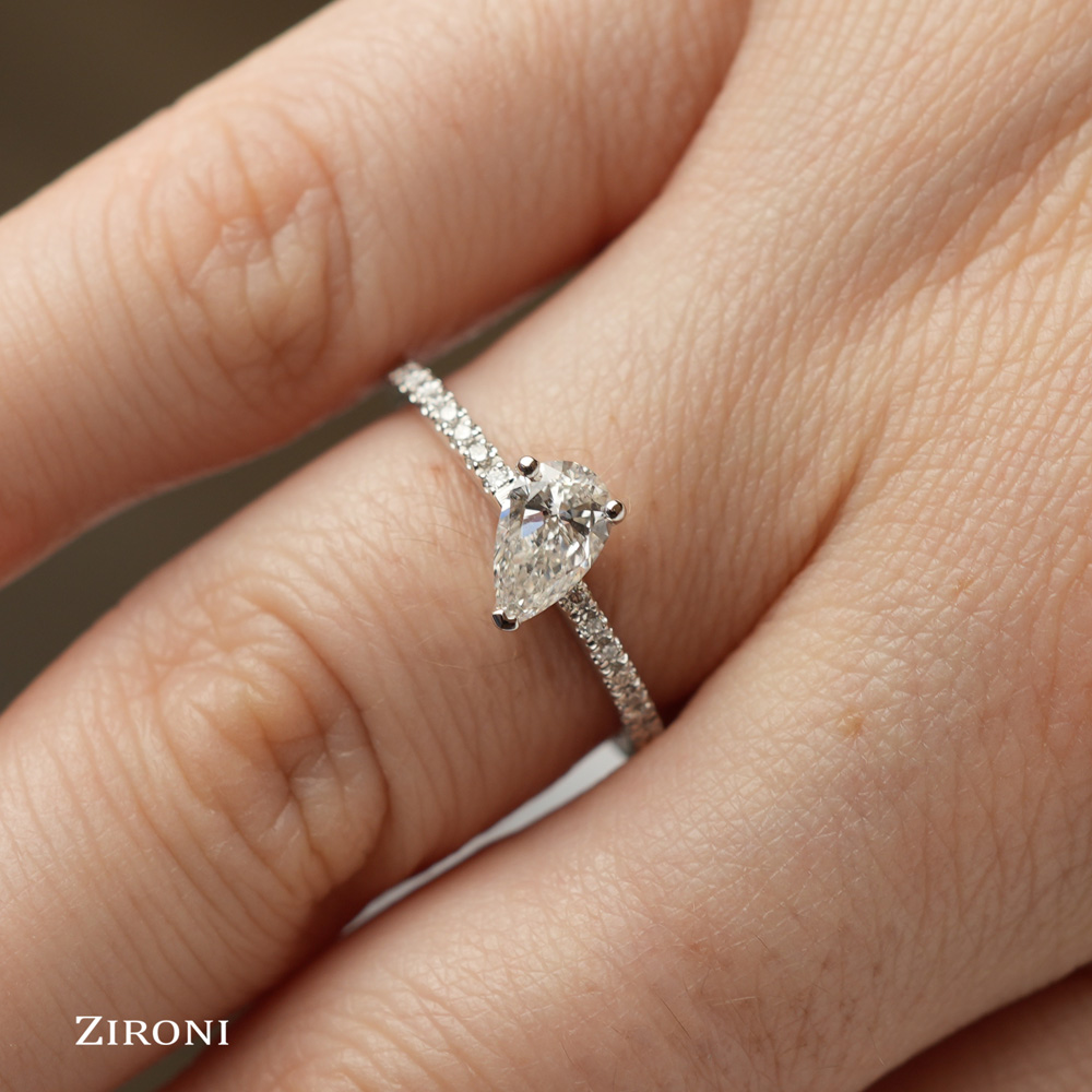 Solitario in oro bianco 18K con diamante taglio pera (ct 0,50) certificato GIA e diamanti taglio brillante sul gambo (ct 0,11)
