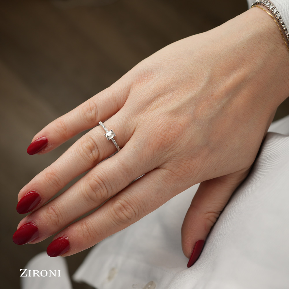 Solitario in oro bianco 18K con diamante taglio smeraldo (ct 0,51) certificato GIA e diamanti taglio brillante sul gambo (ct 0,11)