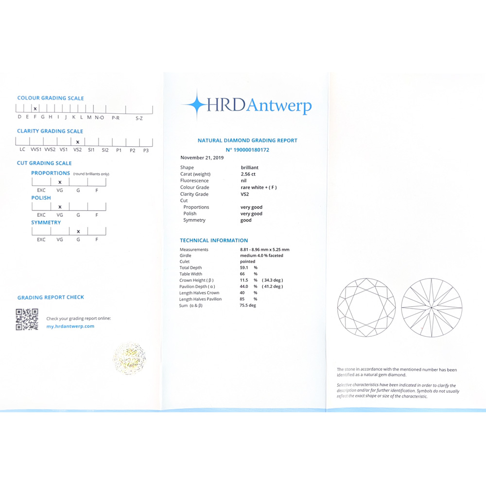 Solitario in oro bianco con diamante (ct 2,56) certificato HRD e diamanti di contorno (ct 0,43)