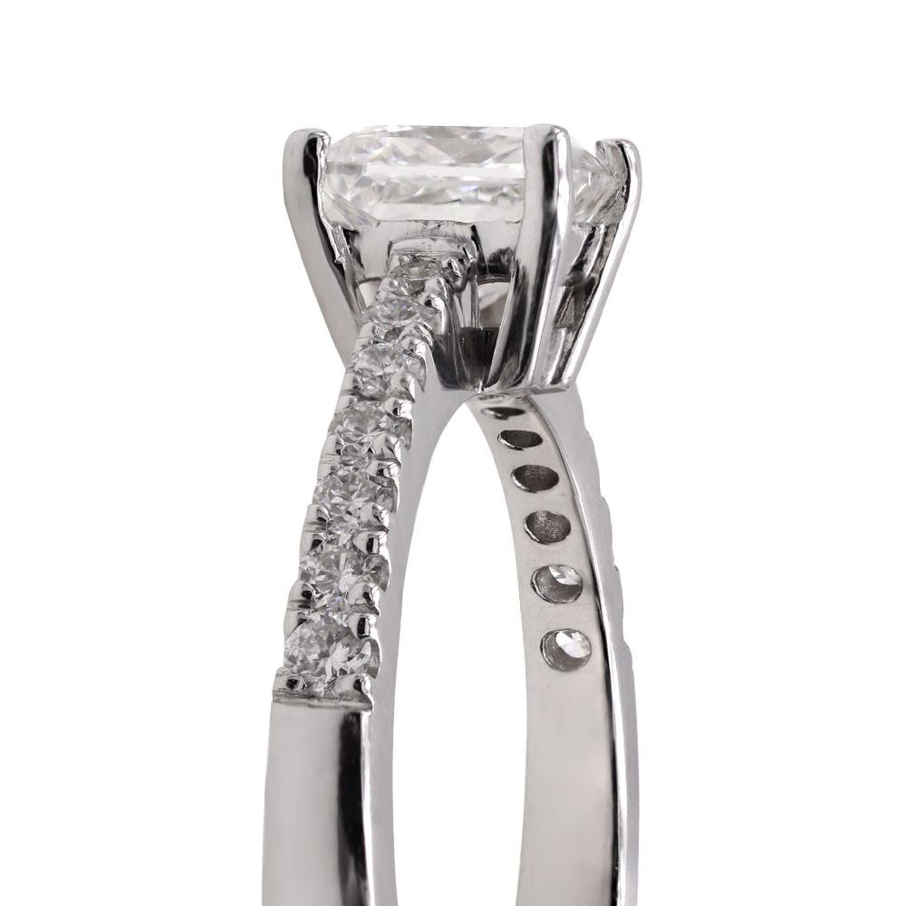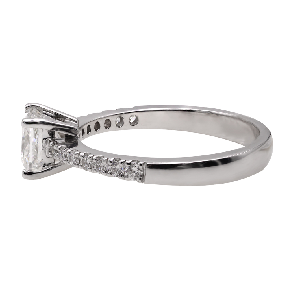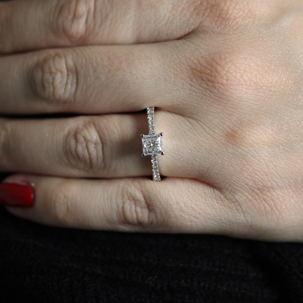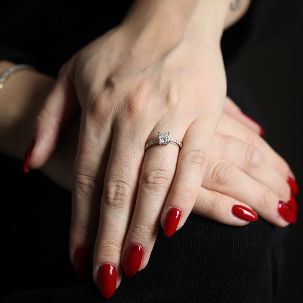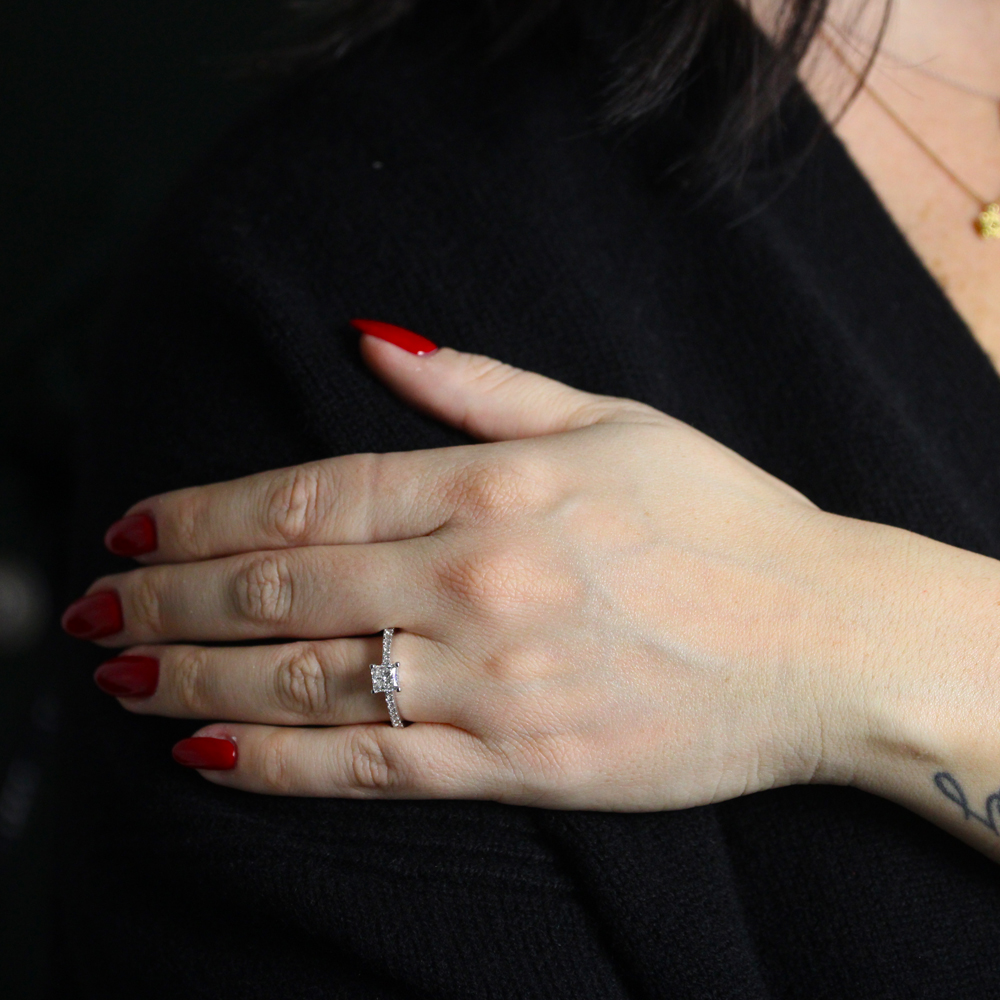 Anello solitario Princess in oro bianco con diamante taglio brillante con certificato IGI e pietre sul gambo