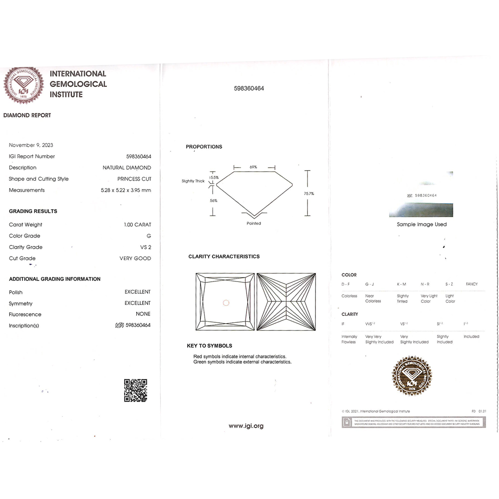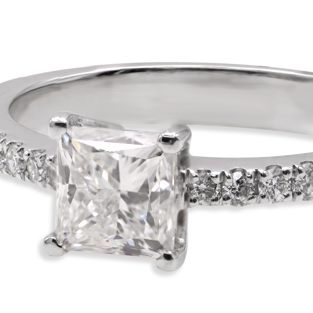 Solitario in oro bianco 18K con diamante taglio princess certificato IGI (1,00 ct - G - VS2) e 2 diamanti taglio brillante (0,20 ct - G - VS)