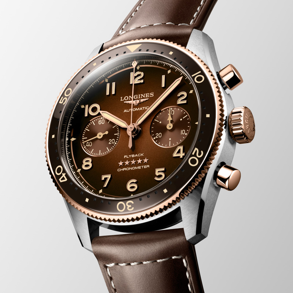 Il Longines Spirit Flyback è un modello di 42 mm di diametro, con funzione flyback, quadrante marrone opaco sfumato, dotato di cappuccio, corona e pulsanti in oro rosa 18 carati, impermeabile fino a 10 bar (100 metri) e alimentato dall’esclusivo cronometro Longines certificato dal COSC con una riserva di carica fino a 68 ore.