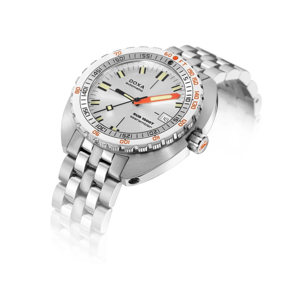 In linea con lo spirito pionieristico di DOXA, il SUB 1500T sonda territori inesplorati con una cassa in acciaio 316L a cuscinetto da 150 bar, equivalenti a 1.500 metri. Il SUB 1500T, dotato della lunetta unidirezionale brevettata con piano di immersione e valvola di rilascio dell'elio, ha un diametro di 45 mm.