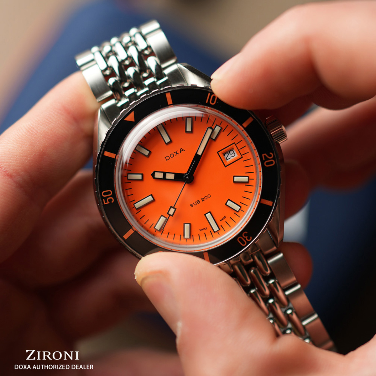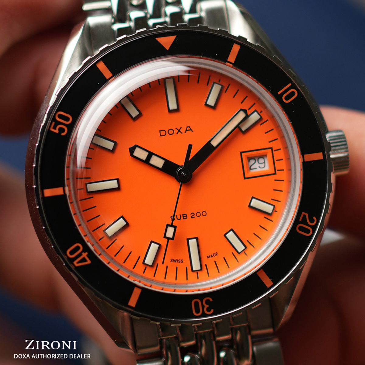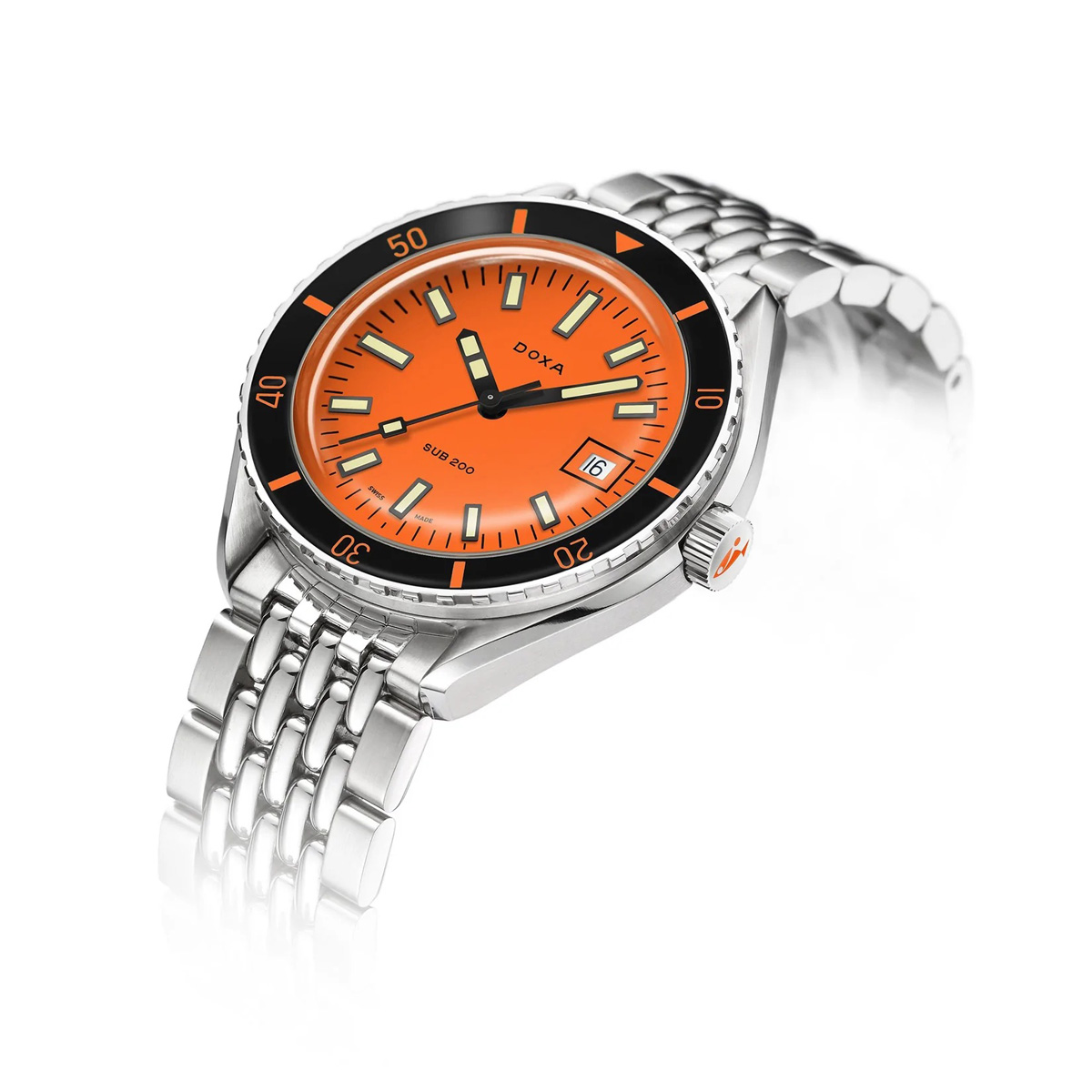 Il SUB 200, di 42 mm di diametro, è dotato di vetro zaffiro antigraffio con trattamento antiriflesso e la curvatura caratteristica del plexiglas bombato utilizzato all'epoca. Impermeabile fino a 200 metri (20 ATM), è dotato di lunetta girevole unidirezionale. Tutti gli elementi che fornisconoinformazioni relative all'immersione, compresa la lunetta, hanno un rivestimento luminescente in Super‑LumiNova®. Il bracciale in acciaio 316L ha una chiusura deployante col simbolo delpesce DOXA.