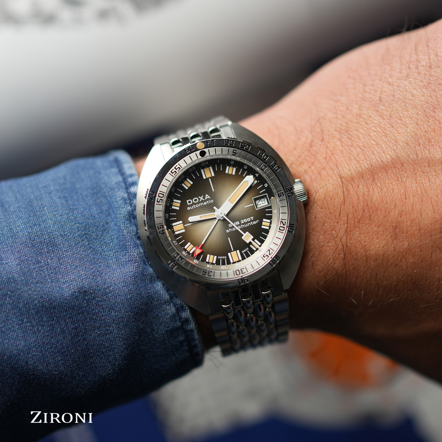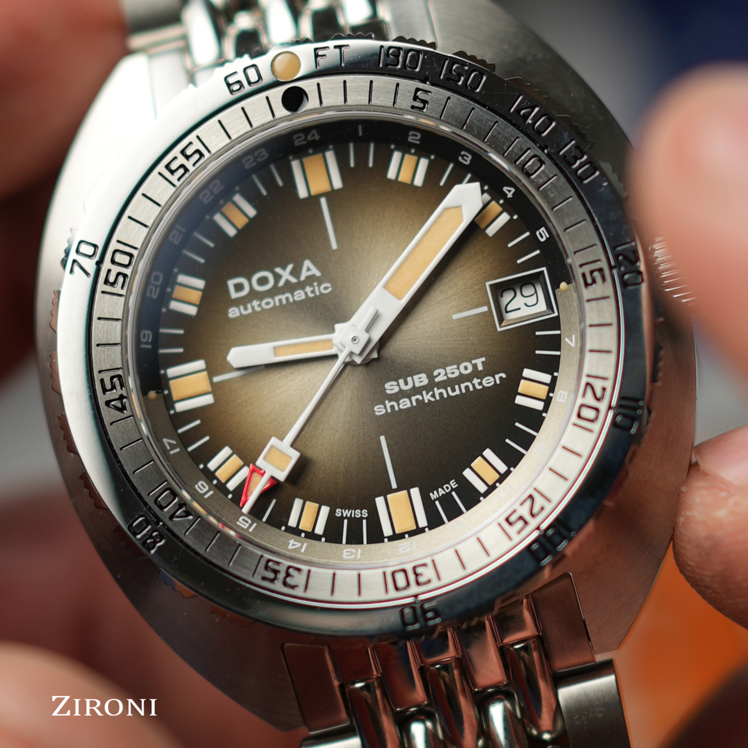 Il SUB 250T GMT segna il ritorno di DOXA alla funzione GMT, combinando la robustezza di un orologio da sub con la funzionalità del fuso orario. Il suo case in acciaio inox da 40 mm garantisce un perfetto equilibrio tra presenza al polso e comfort, mentre la corona a vite e la lunetta unidirezionale con scala per immersione offrono prestazioni da professionista. Con una resistenza all'acqua di 250 metri (820 piedi), è progettato sia per l'esplorazione subacquea che per i viaggi internazionali.