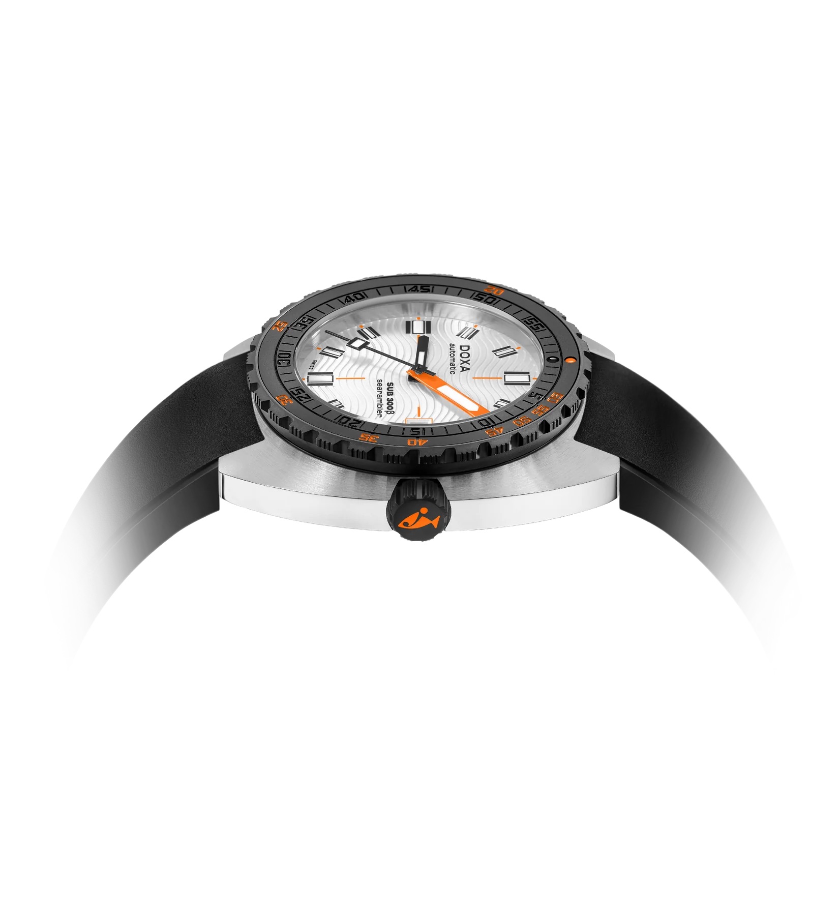 L'orologio sportivo SUB 300β combina funzionalità e stile, mantenendo le caratteristiche fondamentali dell'orologio da strumento in una cassa riprogettata da 42,5 mm di diametro, ora più sottile a 11,95 mm. La lunetta in ceramica nera e la corona a vite ne esaltano il carattere sport-chic, completato da una sofisticata finitura del quadrante sunburst. Disponibile con cinturino in caucciù FKM o bracciale "Beads of Rice" in acciaio inossidabile, entrambi dotati di chiusura pieghevole a cricchetto, l'orologio è resistente all'acqua fino a 300 metri. Con un vetro zaffiro antigraffio, movimento automatico svizzero e una riserva di carica di circa 38 ore, il SUB 300β è progettato per la sicurezza e l'esplorazione. Fedele all'etica non convenzionale di DOXA, fonde lo spirito dei tempi con un look sport-chic elegante e moderno adatto agli ambienti urbani.